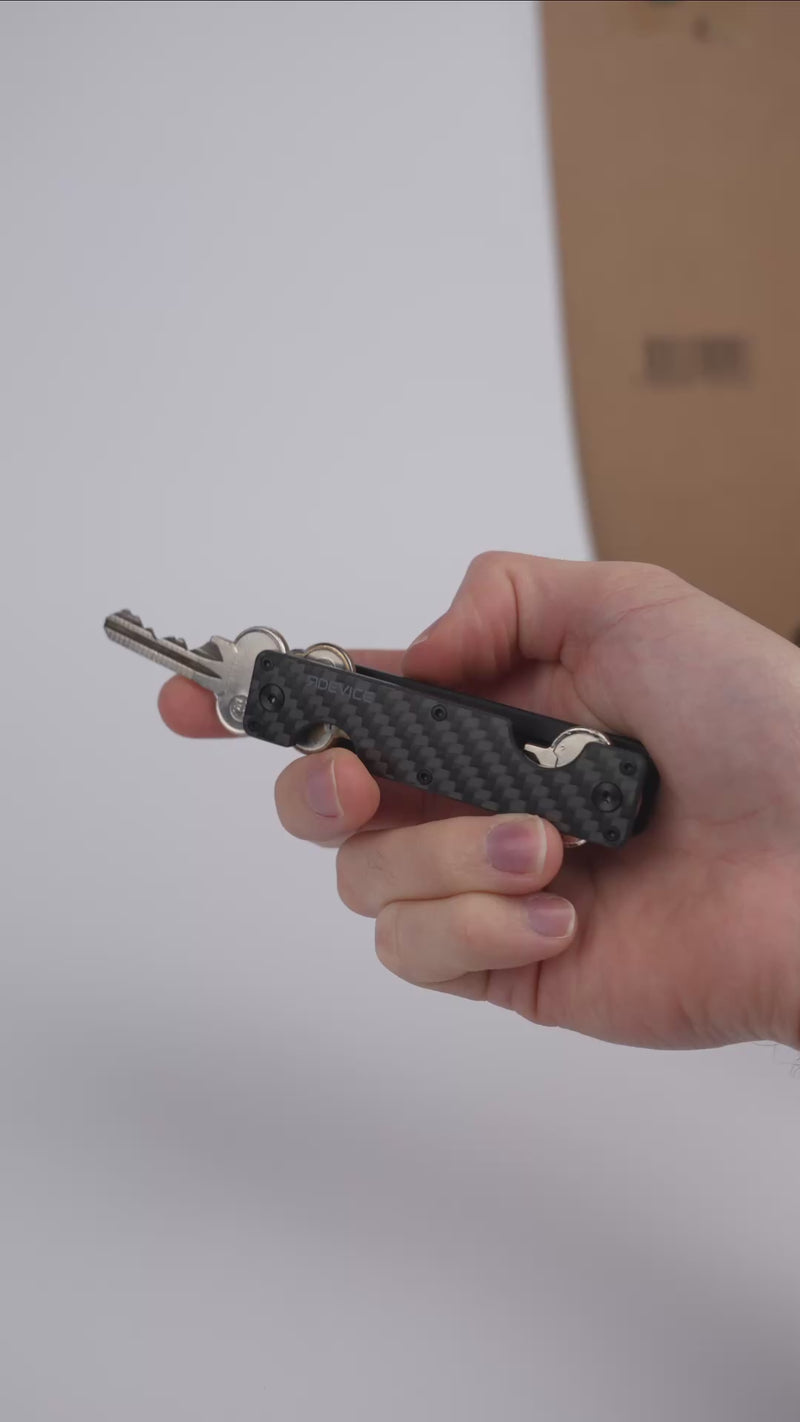 Gefertigt mit einer Außenseite aus Carbonfaser, vereint er Langlebigkeit mit moderner Eleganz. Der intelligente Klappmechanismus ermöglicht schnellen Zugriff auf deine Schlüssel und hält sie gleichzeitig ordentlich verstaut und geschützt. Ein integrierter D-Ring erlaubt das einfache Befestigen eines Autoschlüssels oder Anhängers, während der integrierte Clip sicheren und komfortablen Halt den ganzen Tag über bietet.